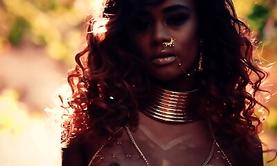 Sumptuous black cowgirl with a pierced pussy enjoying a spicy interracial fuck outdoors