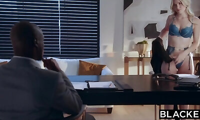 Sexy blond secretary in stockings pleases her black wild boss in the office
